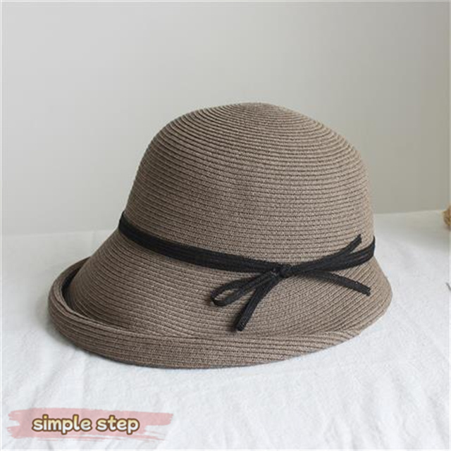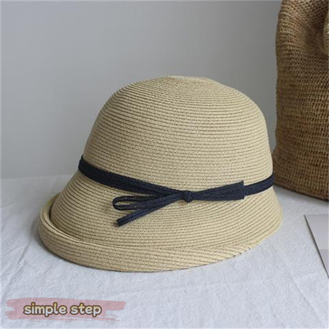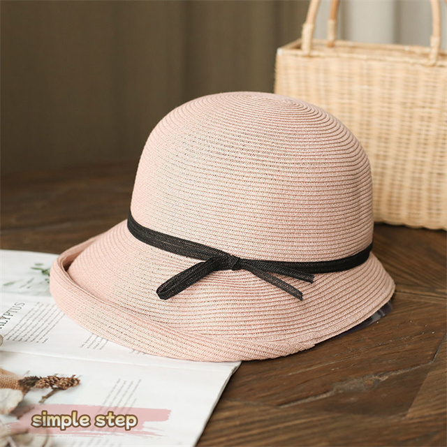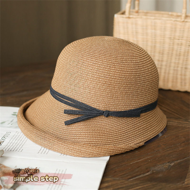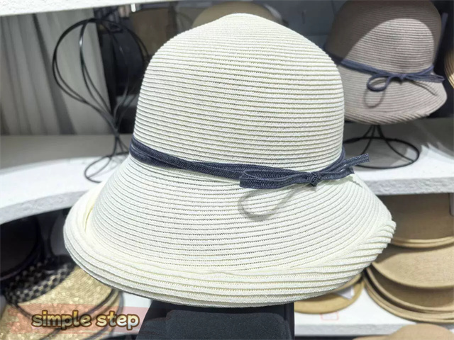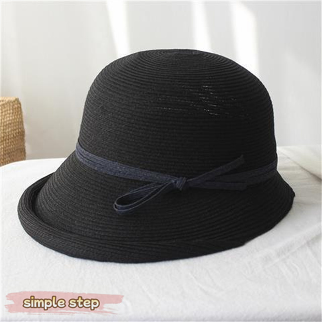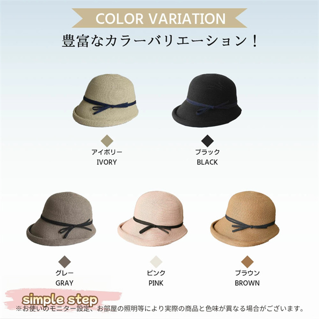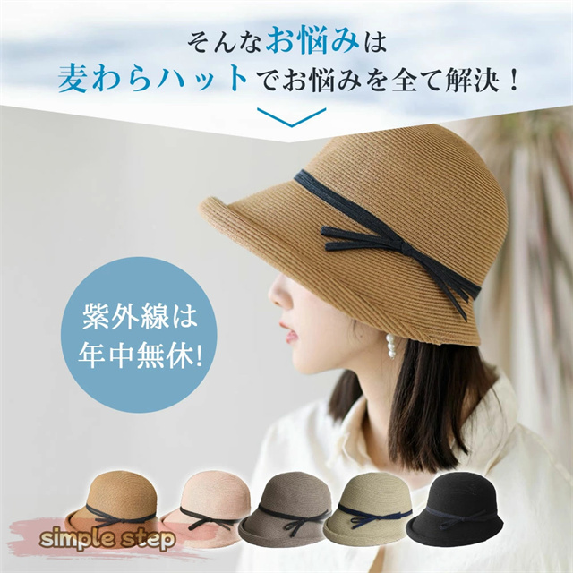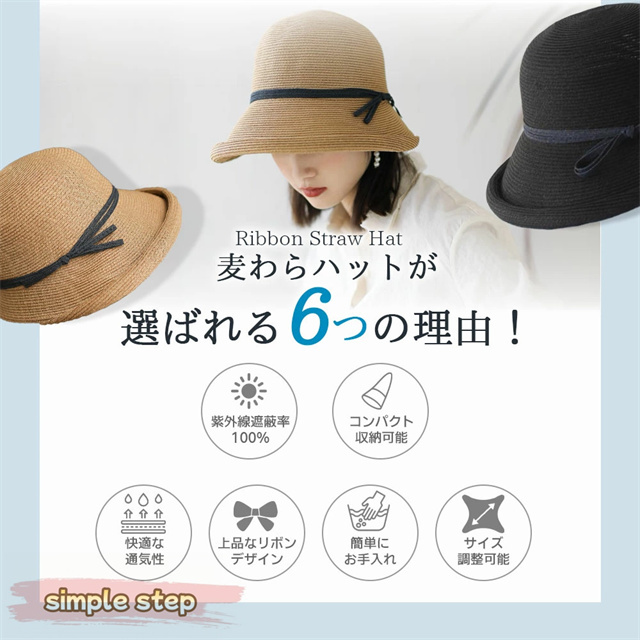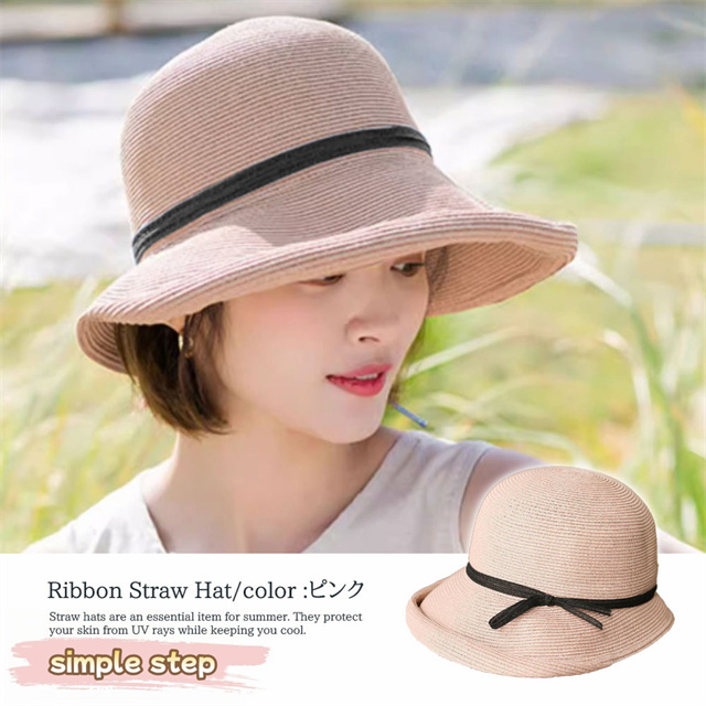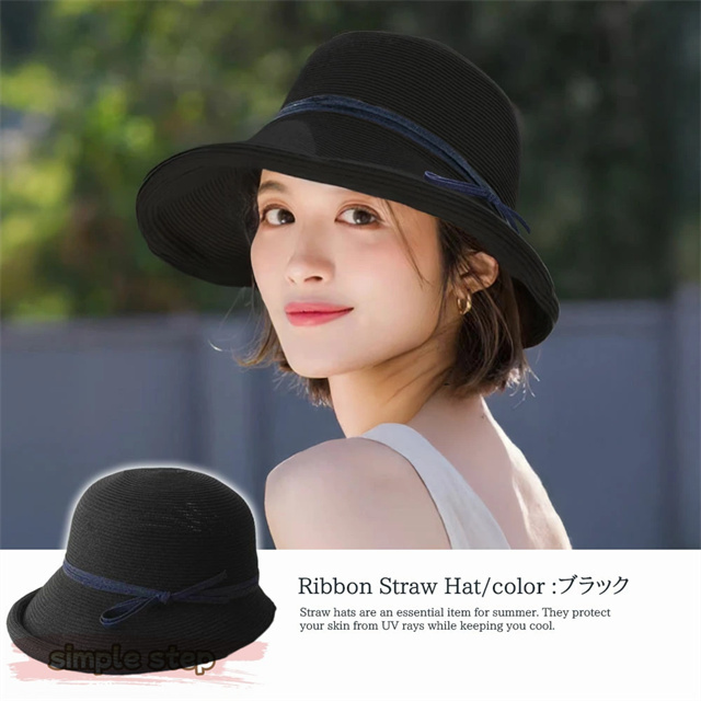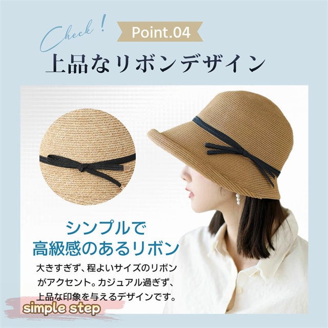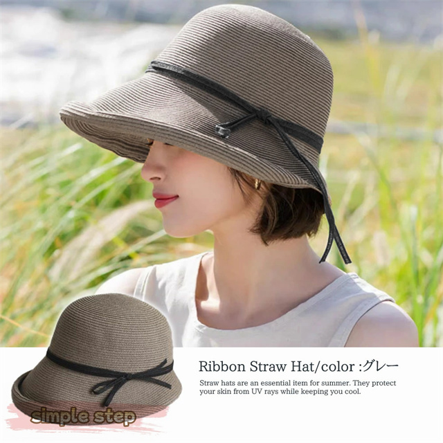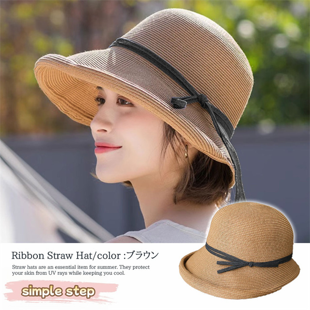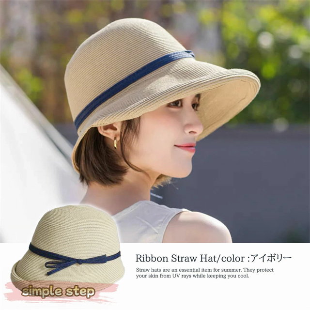 シンプルな麦わら調に上品なリボンがアクセント。大人の女性にぴったりな落ち着いた可愛さで、カジュアルにもリゾートスタイルにも合わせやすい万能アイテムです。
