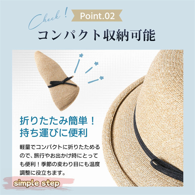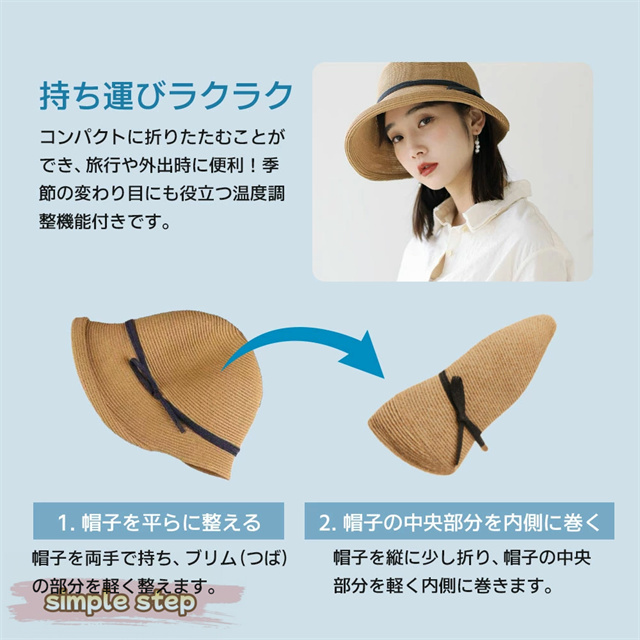 通気性の良い天然風の編み素材を採用し、蒸れにくく快適。軽量なので長時間の使用でも負担にならず、海・山・旅行先など幅広いシーンに活躍します。