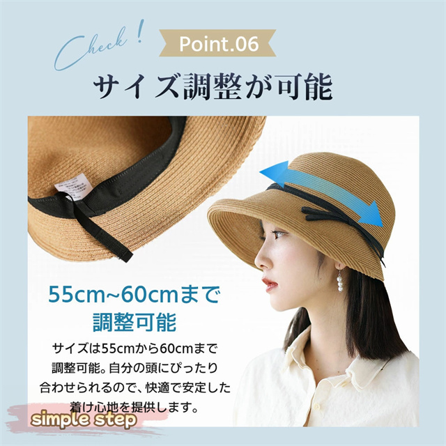帽子の内側にサイズ調整用のアジャスター付き。頭のサイズに合わせてしっかりフィットし、風で飛びにくいのでアウトドアや散歩でも安心です。