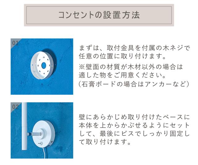 電源のとり方は、コンセントと壁から直接とる直付けと両方に対応しています。コンセントだと場所を気にせず気軽に取り付けできます。壁直付けだとコードが見ないのでスッキリした印象になります。