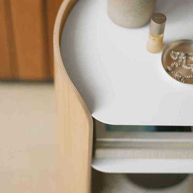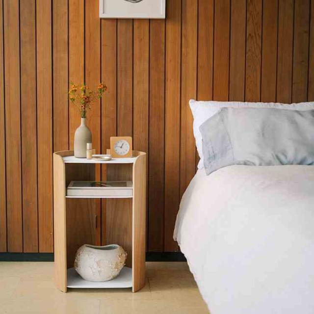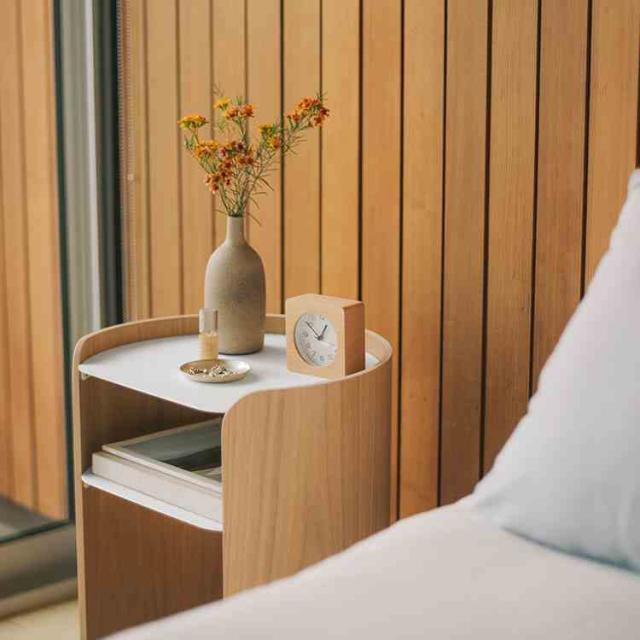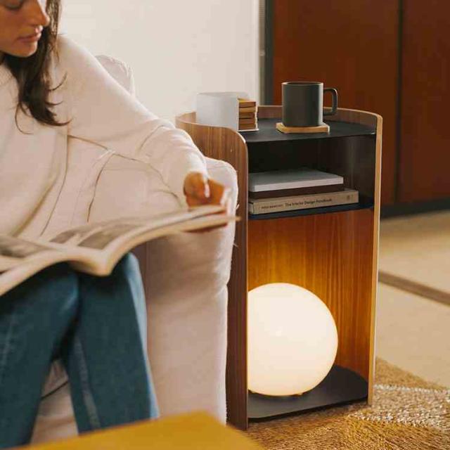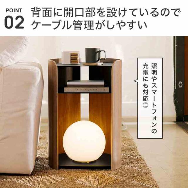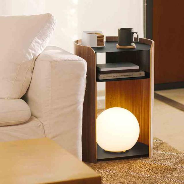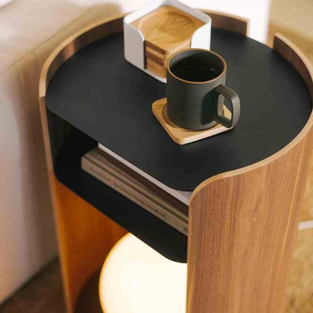 モダンなスチールとスタイリッシュな成型合板をバランスよく組み合わせたサイドテーブルです。木のやわらかく温かな質感を取り入れた丸みを帯びたフォルムに、洗練された印象のスチール棚板を組み合わせました。背面に開口部を設けており、ケーブル管理がしやすく、照明やスマートフォンの充電にも対応します。