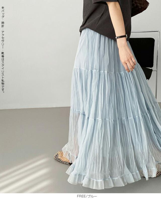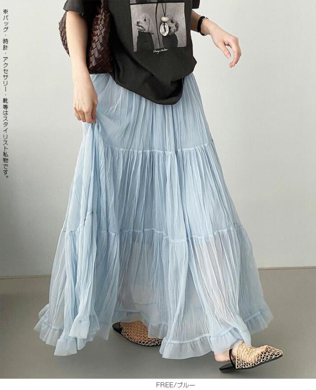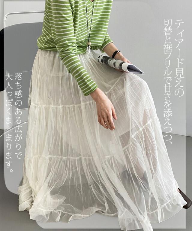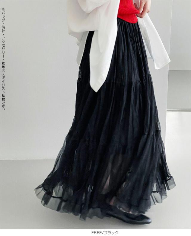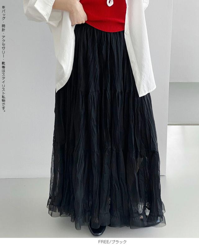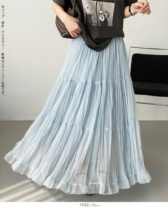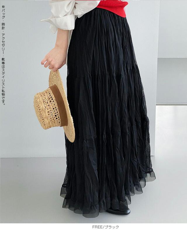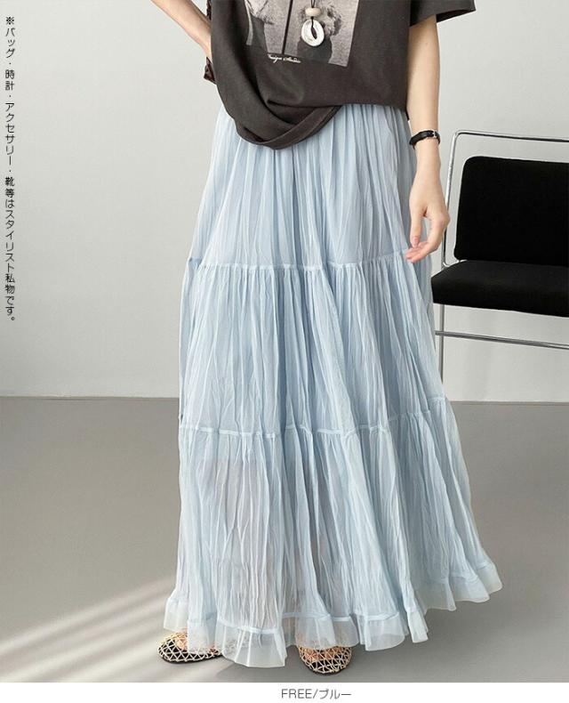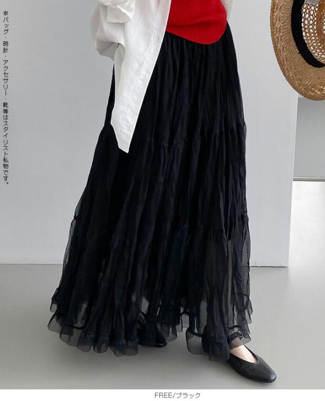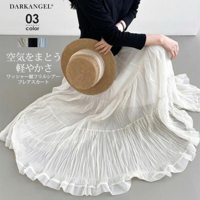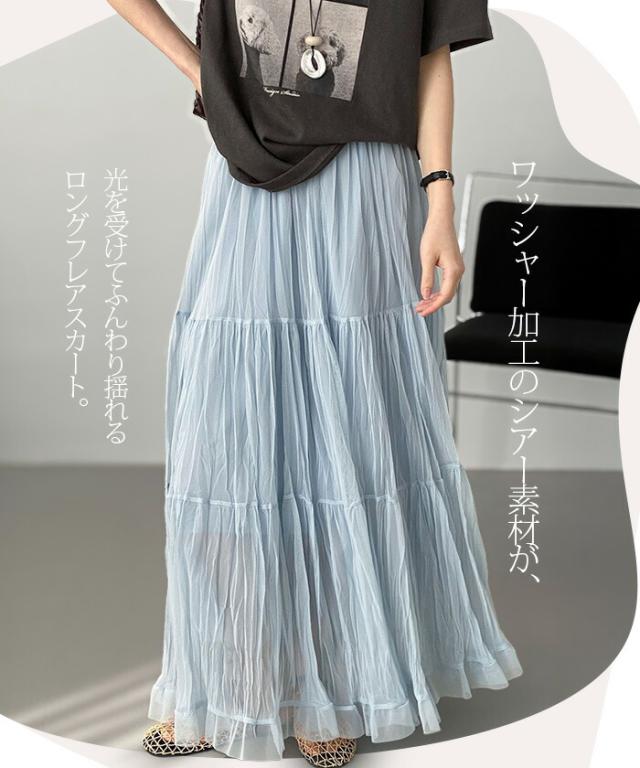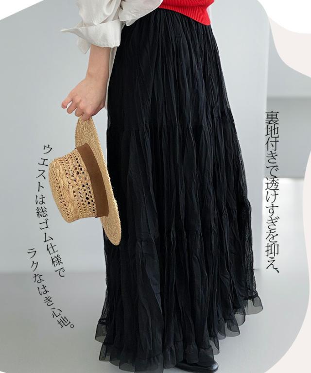先着33名様50%OFFクーポン!スカート フレアスカート レディース ロング マキシ ティアード 透け感 裏地付き ウエストゴム 体型カバー ワッシャー 裾フリル シアー 春夏 きれいめ 大人【ワッシャーシフォン裾フリルフレアスカート】 ダークエンジェル