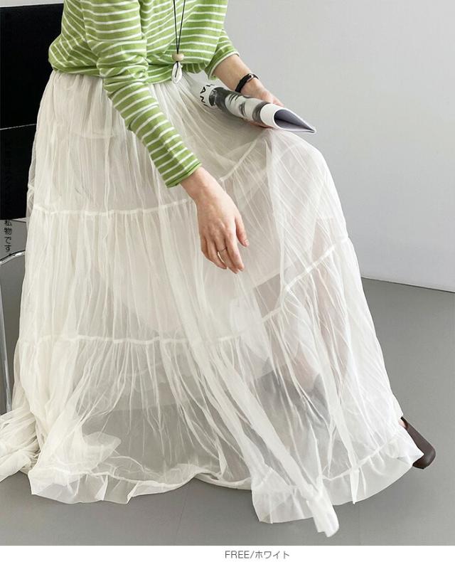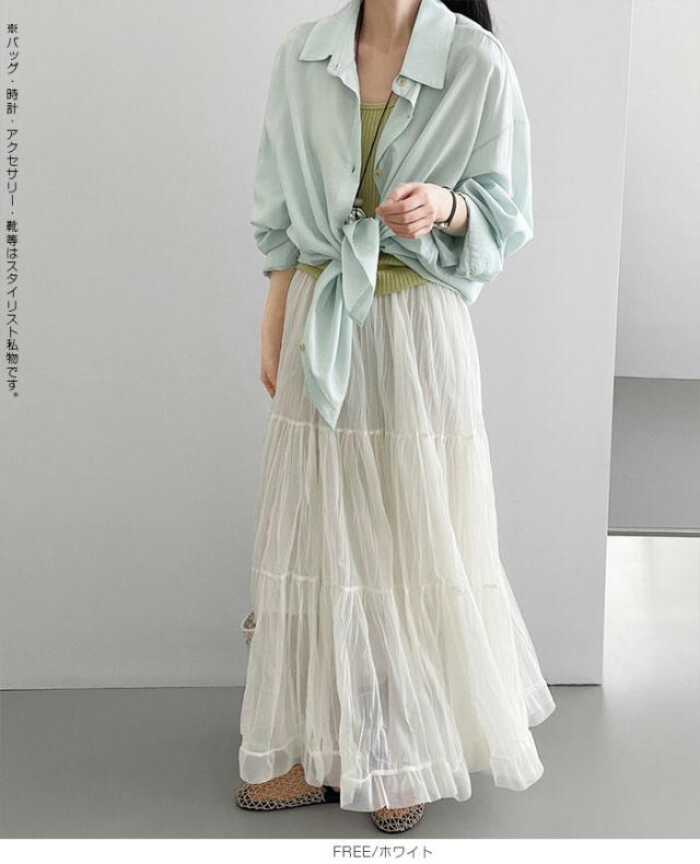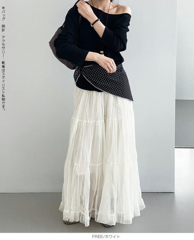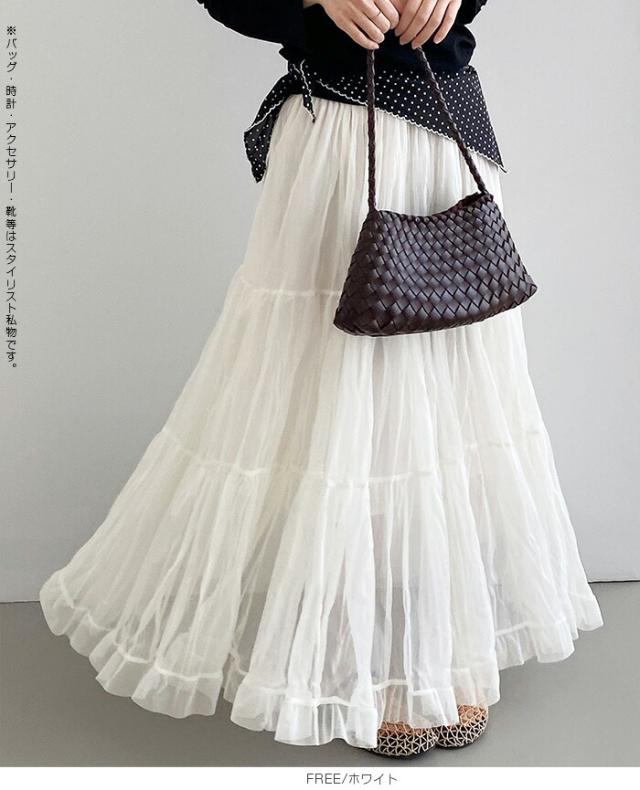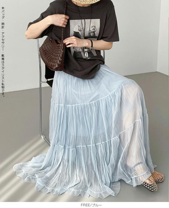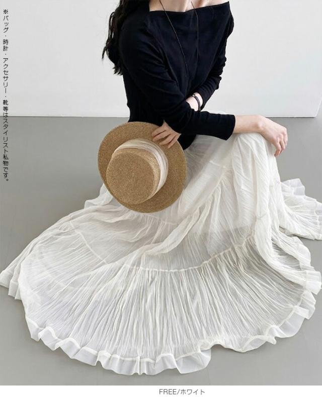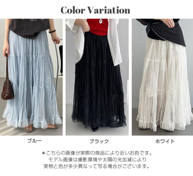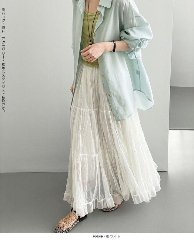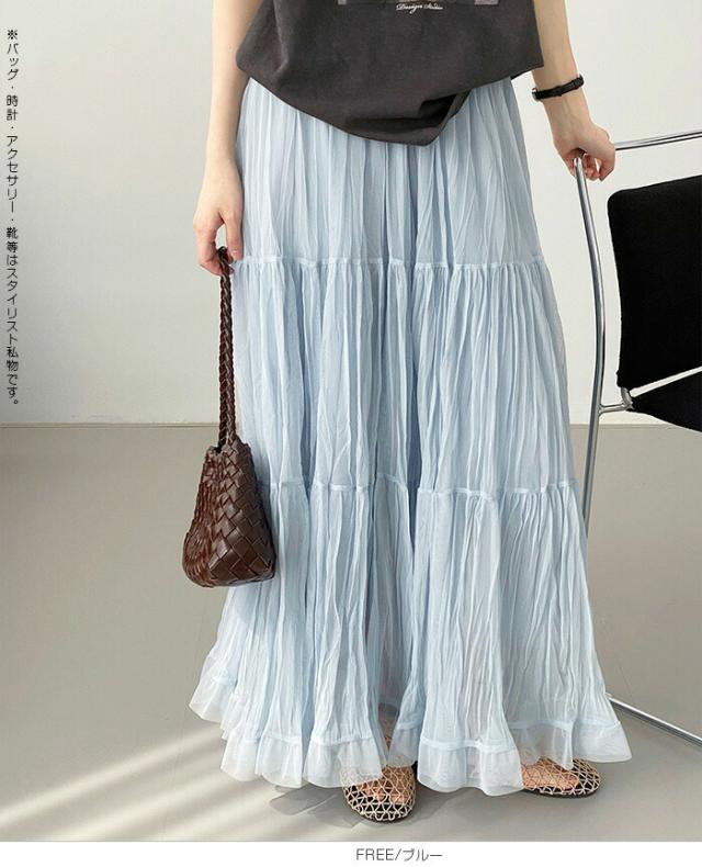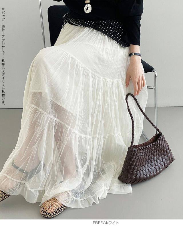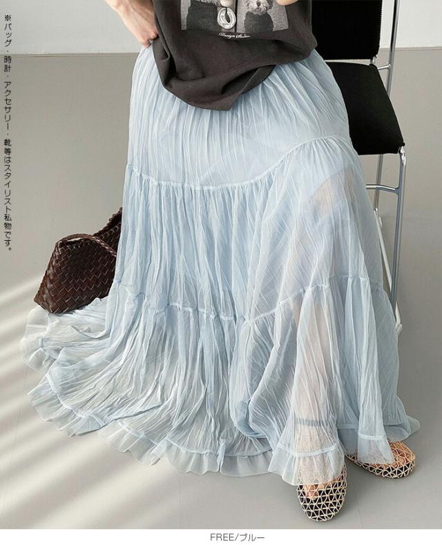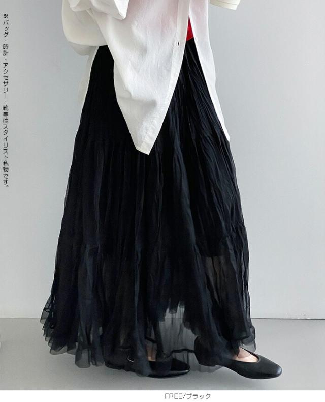 先着33名様50%OFFクーポン!スカート フレアスカート レディース ロング マキシ ティアード 透け感 裏地付き ウエストゴム 体型カバー ワッシャー 裾フリル シアー 春夏 きれいめ 大人【ワッシャーシフォン裾フリルフレアスカート】 ダークエンジェル