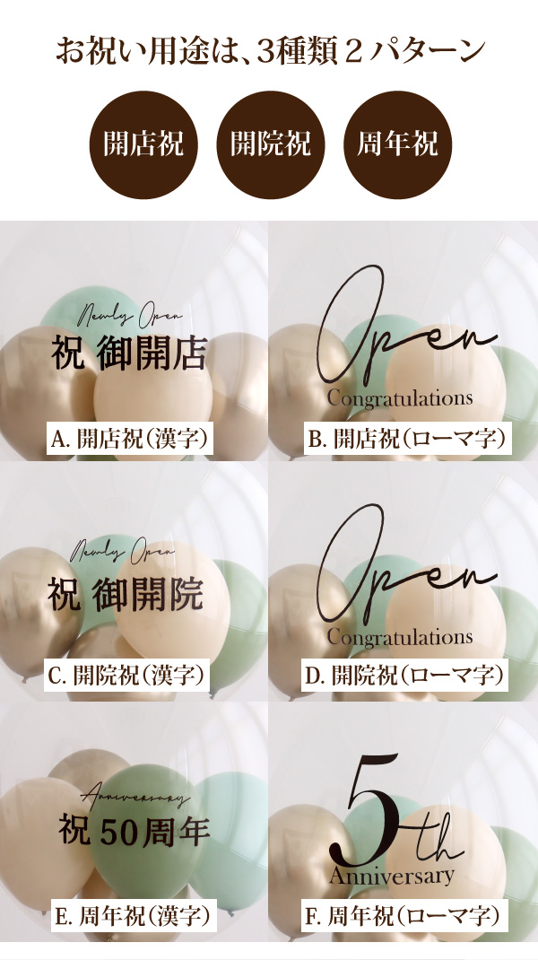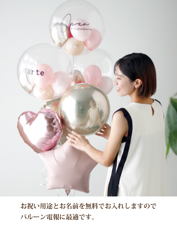 開店祝い・周年祝い・開院祝いの用途とお店の名前が無料でお入れできるので 簡単に特別感のあるバルーン電報が贈れます。