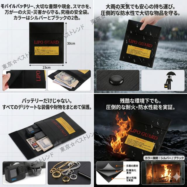 TB-LIPO GUARD 耐火バッグ バック 防爆袋 防火 袋 モバイルバッテリー 保管 リポバッテリー 防水 セーフティーバッグ 貴重品 書類 データ保護 防災グッズ 30×23cm A4相当 グラスファイバー ガラス繊維 不燃素材 マジックテープ 黒ブラック / 銀シルバー