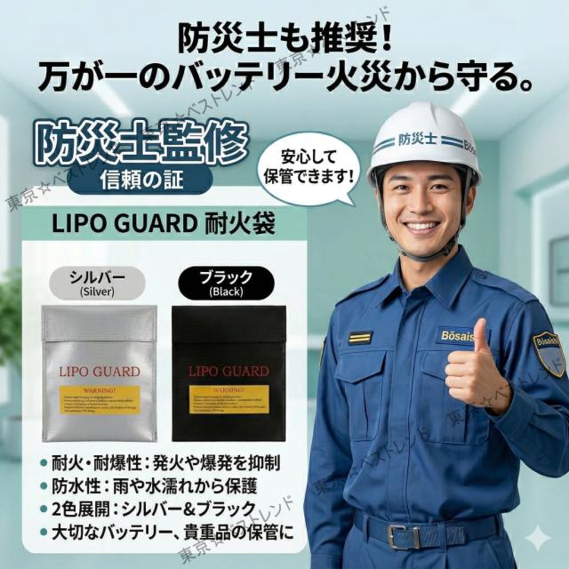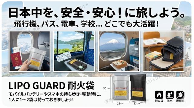 飛行機、新幹線、バス、学校など、人が集まる密室でのバッテリー持ち歩きは常にリスクが伴います。万が一カバンの中で発火しても、「TB-LIPOGUARD」に入れておけば被害を食い止められます。 周囲に迷惑をかけない、現代の「大人のマナー・安全装備」として、ご家族全員分(1人に1〜2袋)の所持を強くおすすめします。