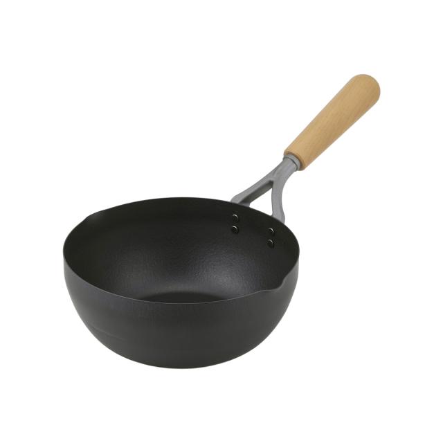 内側にファイバーエンボス加工を施した、こびりつきにくい鉄製の深型フライパン20cmです。繊維状の細かな凹凸加工により、食材とフライパンの接地面が少なくなり、食材がくっつきにくくなっています。