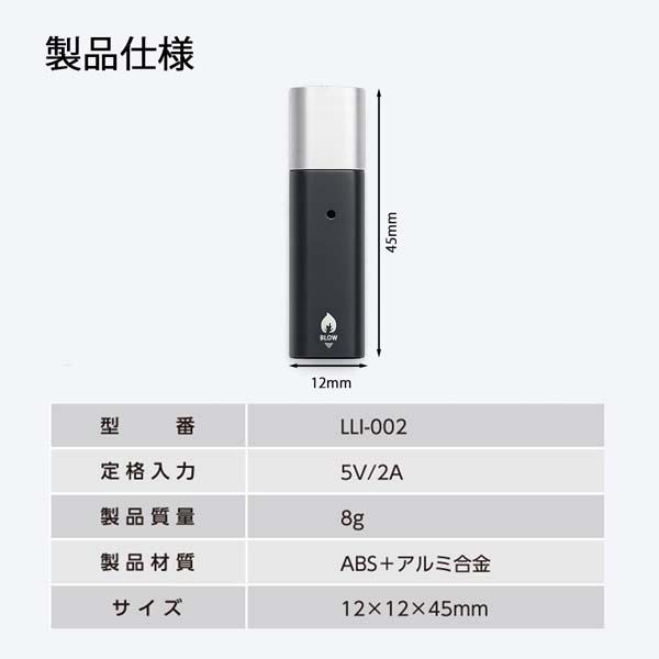 | 商品仕様 | 型番:LLI-001 型番:LLI-002 定格入力:5V/2A 製品質量:8g 製品材質:ABS+アルミ合金 サイズ:12×12×45mm |