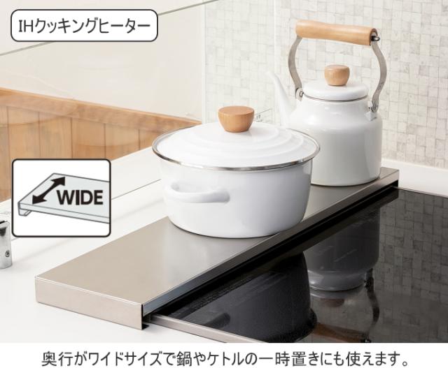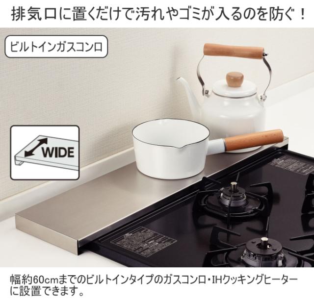 排気口に置くだけで汚れやゴミが入るのを防ぐ。 奥行ワイドサイズで鍋やケトルの一時置きにも使えます。 幅60cmのコンロに対応。 |