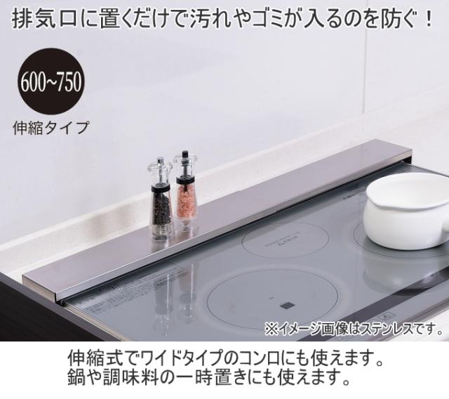 排気口に置くだけで汚れやゴミが入るのを防ぐ。 鍋や調味料などの一時置きにも使えます。 伸縮タイプで幅60〜75cmまでのコンロに対応。 |