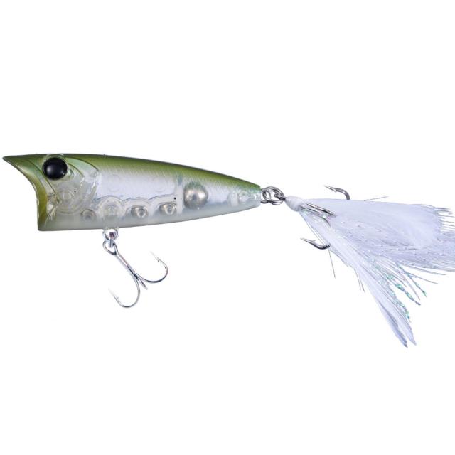 ラウダー50は、意図しない動きをさせず、水にしっかり絡ませるために小型ボディながら4ウエイトに行きついた。飛距離も出て水面で風に流されにくく、ライン抵抗で引っ張られないよう高比重で立ち気味の姿勢を選択。飛びに悪影響を与えない最大量のフェザー&ティンセルが着水音をソフトにし、水をしっかり掴み移動距離を抑え一点集中で誘える。サイズ以上のアピール力のために大型カップ&Break Water構造を施し、水面にフタをしやすくボコッというPOP音と飛沫&水柱のスプラッシュを実現した。こうして小さいが故に調整範囲が狭い小型ポッパージャンルの中で、その性能の限界を乗り越えることでこれまで以上の釣果をもたらす戦力となる。