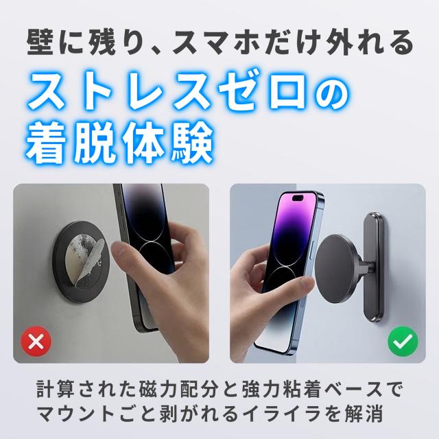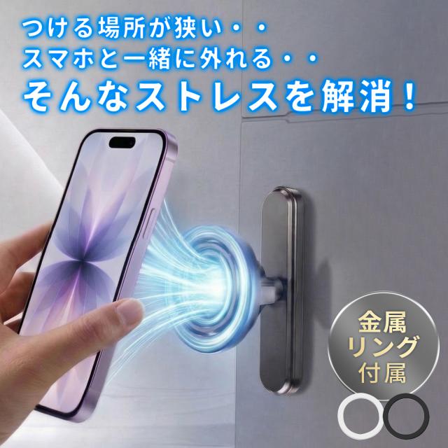 スマホホルダー マグネット MagSafe対応 マグセーフ スタンド 壁面 強力 磁石 iPhone Android 対応 全機種 金属リング付属 スタイリッシュ スリム 省スペース インテリア 隙間 撮影 自撮り 角度調整 キッチン 料理 ジム 筋トレ フォームチェック