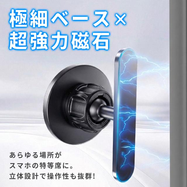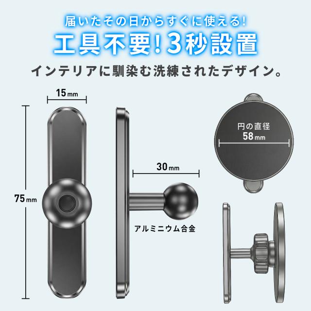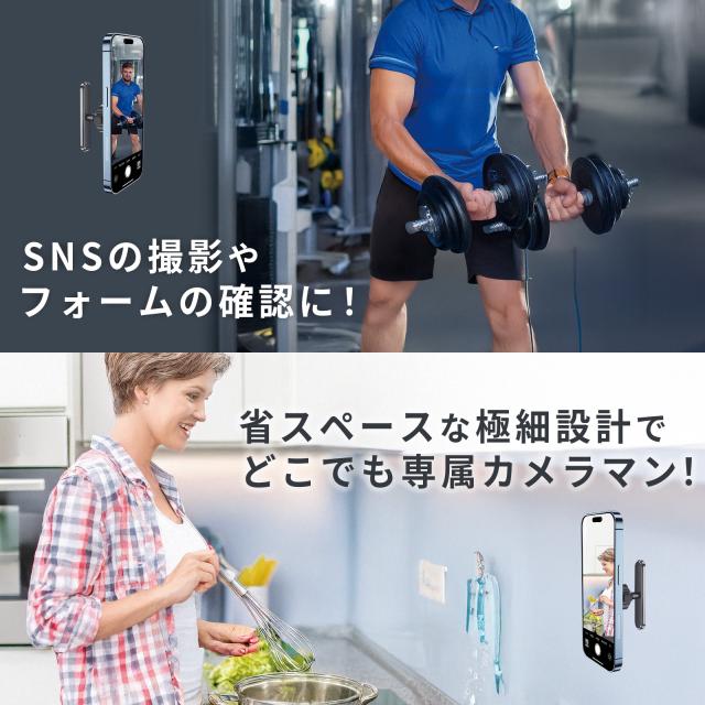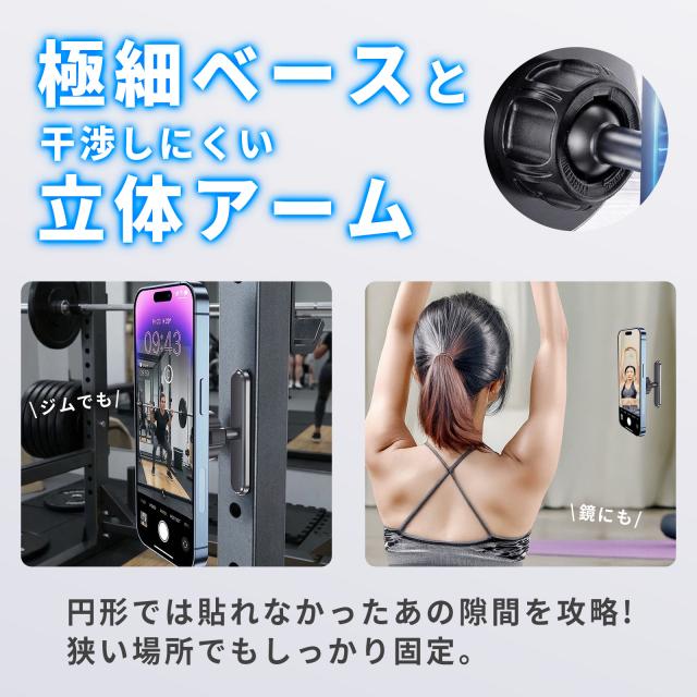 [ 極細ベースと強力磁力で使いやすさ抜群のスマホホルダー ] 【 優れた5つの ポイント 】 (1) わずか15mmの極細ベース (2) ストレスゼロの着脱体験 (3) 強力N52磁石を採用 (4) 自由自在な角度調整 (5) iPhone・Android全機種対応 【 隙間を攻略!わずか15mmの極細ベース 】 幅15mmの極細設計により従来の円形では貼れなかった狭い隙間にも設置可能です。キッチンやデスク周りなど場所を選ばずどこでも専属カメラマンのように固定できます。 【 ストレスゼロ!スマホだけ外れる独自設計 】 スマホを取り外す際もベースが壁に残るよう計算された磁力配分を実現しました。マウントごと剥がれてしまうイライラを解消し片手でスムーズに着脱いただけます。 【 強力吸着!N52磁石採用 】 強力な磁力を持つN52磁石を搭載しスマホを強力な磁力で確実に保持します。激しい振動でも微動だにしない安定感があり大切なデバイスを落下から守ります。 【 角度自在!SNS撮影や動画視聴も快適 】 立体アームと回転機構により縦横お好みの角度へ瞬時に調整可能です。SNSの動画撮影やフォーム確認などシーンに合わせて最適な視野角を確保できます。 【 全機種対応!届いたその日にすぐ使える 】 洗練されたアルミ合金デザインはどんなインテリアにも自然に馴染みます。付属の金属リングを使えばMagSafe非対応の機種やケースでもすぐに利用可能です。 |