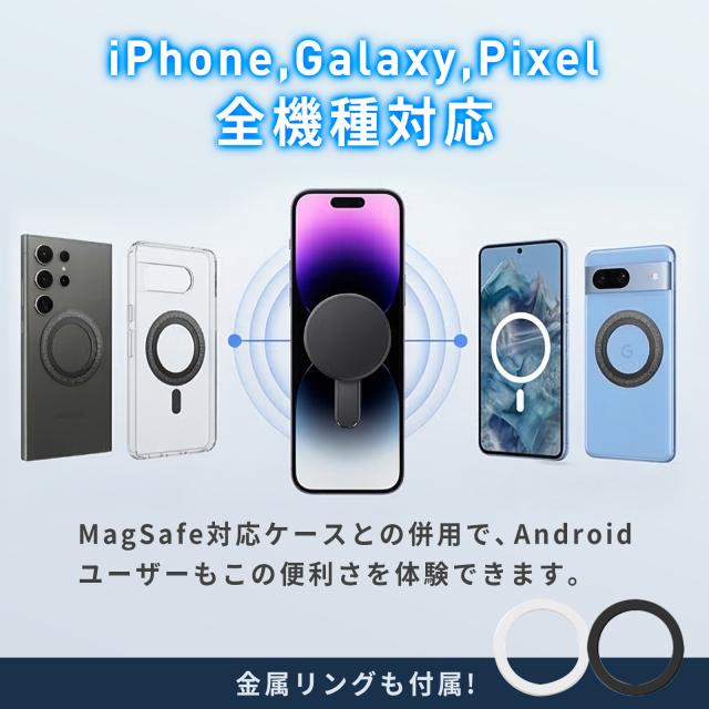 | MagSafe対応 極細ベース 15mm幅 超強力磁石 角度自由 アルミ合金製 全機種対応(リング付) |