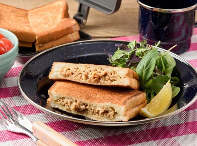 キャンプシーンで簡単に楽しめるホットサンドの具材缶です。