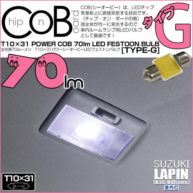| 商品名 | SUZUKI LAPIN[HE33S/HE93S 前期]対応 室内灯用 T10×31枕型 LEDバルブ T10×31 POWER COB 70ルーメン LEDフェストンバルブ[タイプG] ホワイト|面発光|超拡散180°|無極性|1セット1個入り |
