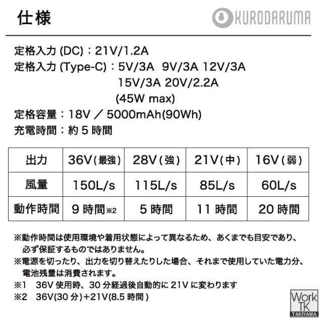 2026年新型 最大36V クロダルマ ファン・バッテリーフルセット 春夏 メンズ レディース 仕事服 おしゃれ 空調ウェア 涼しい ファンバッテリー付き kd-26898-l3