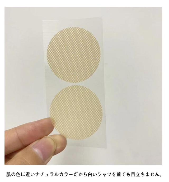 | サイズについての説明 | ※サイズ:直径約3.5cm ※実寸はメジャー採寸の為、若干の誤差が生じる場合があります。 ※使用方法:1.本製品を使用する際は、事前に貼付部位を清潔にし、乾燥させてからご使用ください。2.剥離紙をはがし、中央部分をバストトップにあて、空気が入り込まないように軽くおさえてしっかり肌に密着させてください。3.ご使用後はゆっくりはがしてください。 |