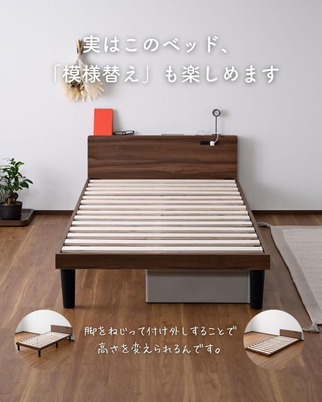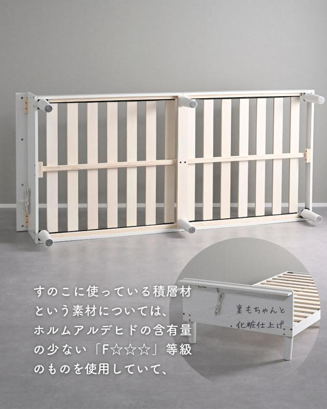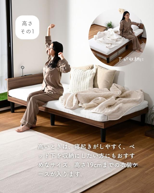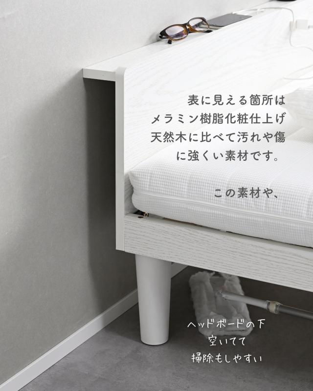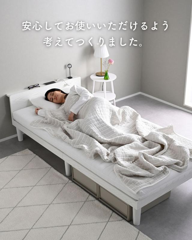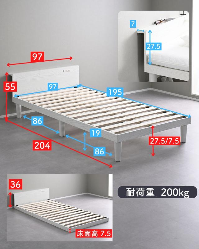 | 商品説明 | ●1梱包でお届けしますが、重たく、玄関先までのお届けとなります。搬入、組み立て、設置はお二人以上での作業がおすすめです。 ●プラスドライバーとマイナスドライバーをご用意ください。 ●スペースを極力抑えた、シンプルなシングルベッド ●床置きローベッドにもなる床面高さ2段階調節 ※ヘッドボードは必ず壁付けして設置してください。 ●F☆☆☆グレードの積層材及びMDF使用 ●キズにも強いメラミン樹脂加工のフレーム ●フローリングへのキズ防止にフェルトシール付属 ●ベッドボードには2口コンセントが付いていて、枕元でスマホの充電が可能 ●棚は手前がこぼれ止めになっているので、壁に立てかければスタンドとしても活躍 ●棚内寸: 奥行7 幅96cm、こぼれ止め立ち上がり: 1cm ●2口コンセント、合計1500Wまで、コード長さ1.7m(棚の右側に配置) ●ヘッドボードの角は丸角の優しいデザイン ●床面の高さは2段階: 27.5/7.5cm ●【床面高さ27.5cm時】ベッド下には高さ19cmまでの衣装ケースも置いて収納スペースとしても活躍 ●【床面高さ7.5cm時】ほぼ床寝スタイルのフロアベッド ●ベッド下:幅86 高さ20cmのスペースが前後にあり、幅39×高さ19cmの衣装ケースなら合計4個収納可能 ●床面サイズ: 幅97 長さ195cm ●床面は厚み15mmのある積層材すのこを、補強フレームで支える、きしみも少ない頑丈設計 ●すのこ隙間: 約6.5cm(中央8.5)cm、7枚×2組で合計14枚すのこ ●フレームやヘッドボードには、湿気や傷に強い、メラミン樹脂化粧の素材を使用 ●静止耐荷重: 200kg ※本製品は最大荷重試験の7000N(約700Kg)をクリアした商品です。当社では安全を考慮し、本商品は耐荷重200Kgに設定しております。耐荷重は保証値ではございません。 |