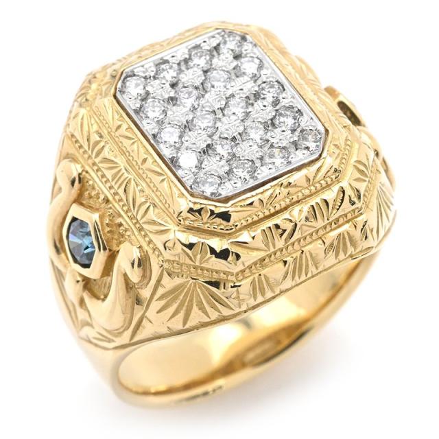 0.66ct天然ダイヤモンド 印台 リング 16号 K18YG ブルートパーズ パヴェ ダイヤ 18金 金無垢 イエローゴールド 地金13.9g 中古 送料無料