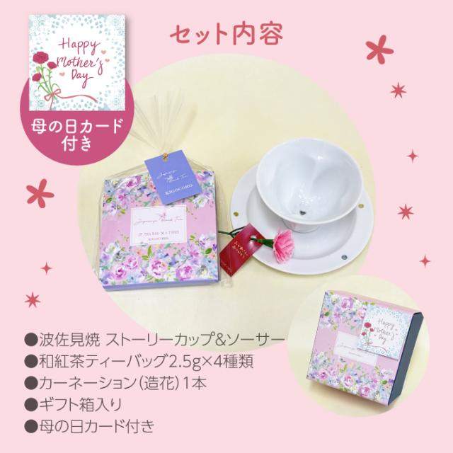 【母の日ギフト 2026】和紅茶 と 波佐見焼 ストーリーカップ & ソーサーギフト 母の日メッセージ・カーネーション付き 造花 ティーバッグ おしゃれ 国産紅茶