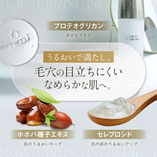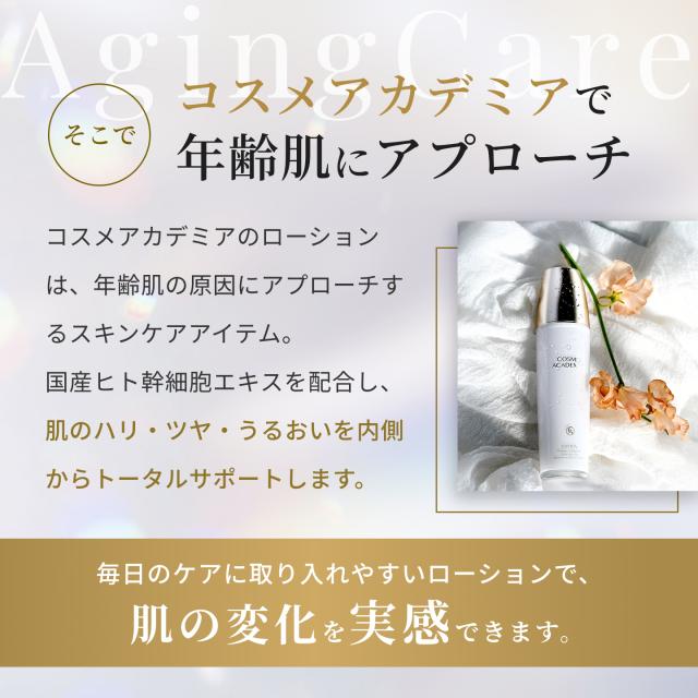 コスメアカデミアは独自成分の持つ美肌力に着目し、科学の力で肌を土台から整えることで、透明感とハリのある肌へと導きます。次世代の美容成分であるヒト由来幹細胞エキスに加えて、うるおいを高める4種の保湿成分や天然の植物エキスを配合。大人の肌悩みにしっかり働きかけて年齢に負けない美しい素肌へと導きます。