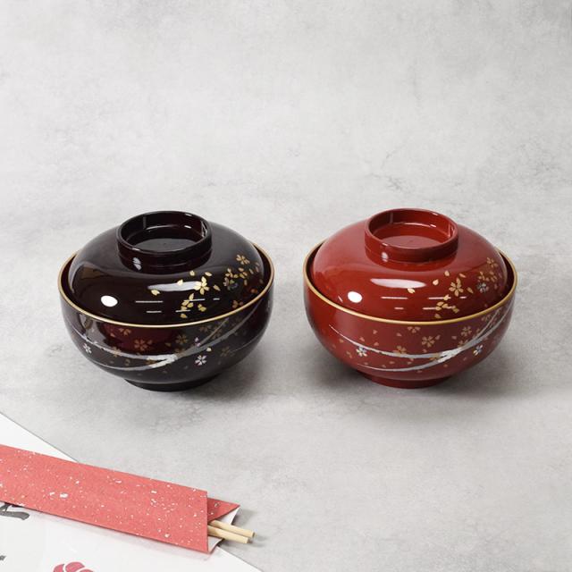 四季雑煮椀 13.3cm 400cc はるか 食洗機可 日本製 汁椀 お椀 和食器 蓋付き椀 吸い物椀 樹脂食器 軽量食器 割れにくい 和風デザイン 食卓 お祝い食器 来客用食器 高級感 和モダン 朱色 和柄 桜柄 金彩 和食用 普段使い