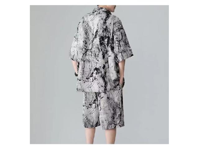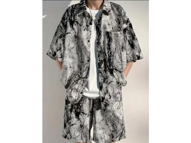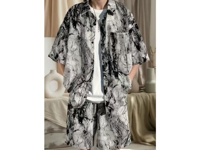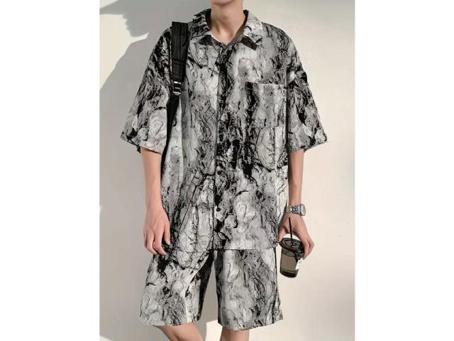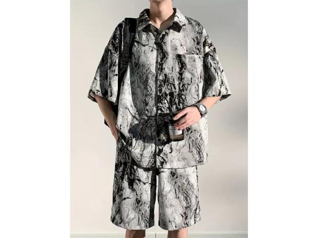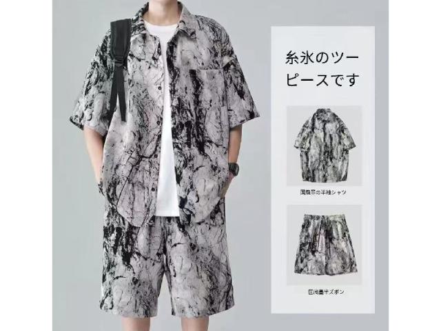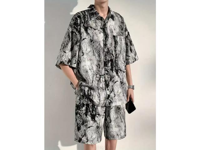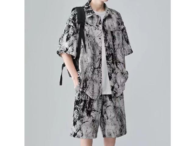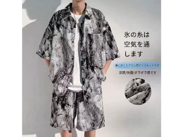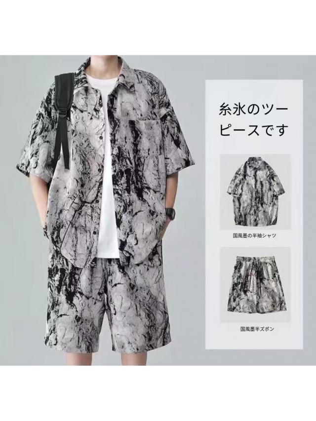 メンズ セットアップ 夏 アイスシルク 水墨画 半袖シャツ ショーツ 2 点セット 通気性抜群 さらさら ゆったり