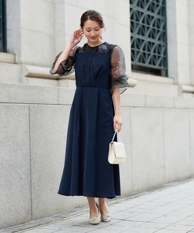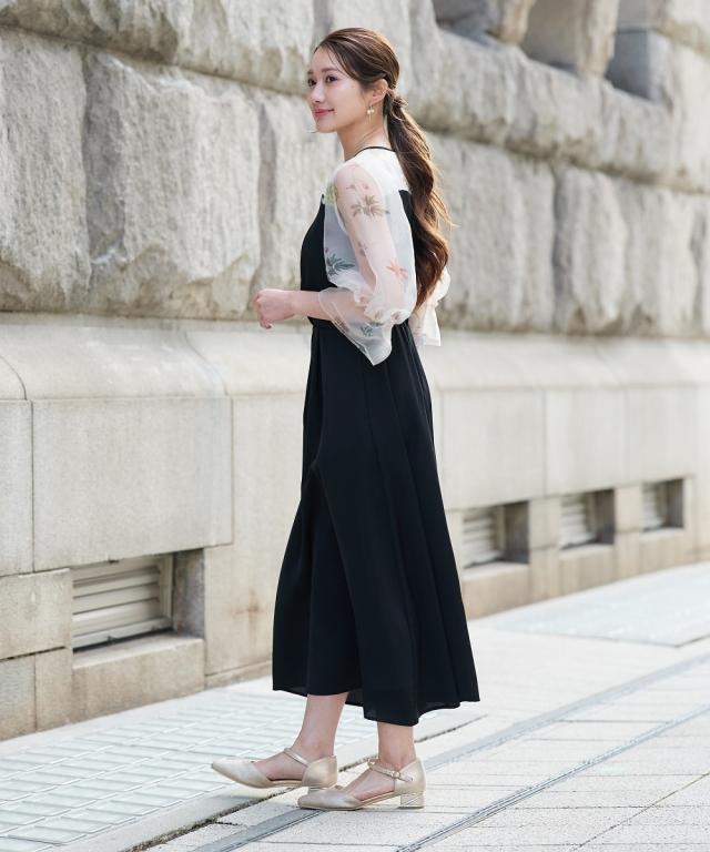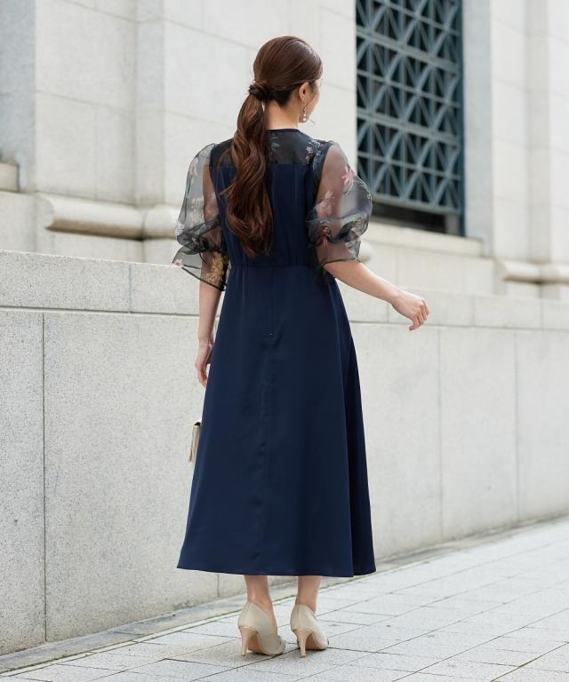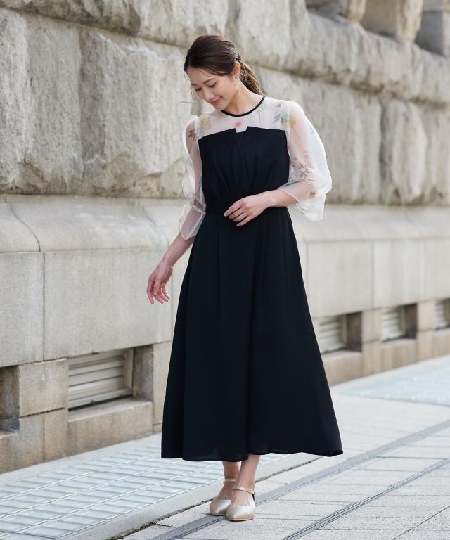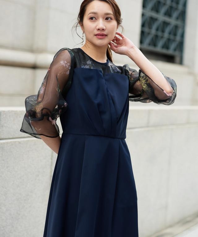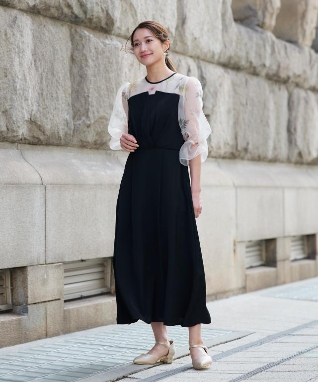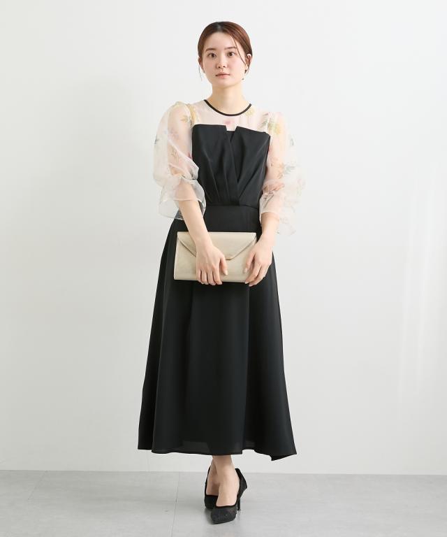 花柄プリント×シアー袖の異素材ドッキングロングドレス 繊細な花柄プリントと、透け感のあるシアー素材を贅沢に組み合わせた、一際目を引くオケージョンワンピース。落ち着いたの身頃が全体を程よく引き締め、甘すぎない「大人のフェミニンスタイル」を叶えます。 ・こだわりポイント 華やかな花柄プリント: デコルテから袖にかけてあしらわれた繊細なプリントが、顔まわりをパッと明るく華やかに演出。 立体感のあるパフスリーブ: 柔らかなシアー素材を使用したボリューム袖が、トレンド感のあるシルエットと軽やかさをプラス。 洗練されたバイカラー: バイカラーのコントラストが、上品で都会的な印象を与えます。 美シルエット設計: ウエスト位置を高く設定することで、一枚で着映えするエレガントな立ち姿を実現。 ・体型カバーポイント 二の腕カバー: ふんわりとしたパフスリーブが、気になる肩周りや二の腕を自然に隠しつつ、華奢な印象に。 スタイルアップ効果: 高めのウエスト切り替えにより、脚長効果を強調。小柄な方でもバランス良く着こなせます。 レッグラインのカバー: 足首まで届くロング丈のフレアスカートが、下半身のラインを拾わず、歩くたびに優雅な揺れ