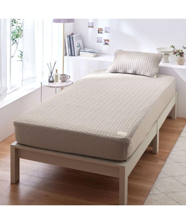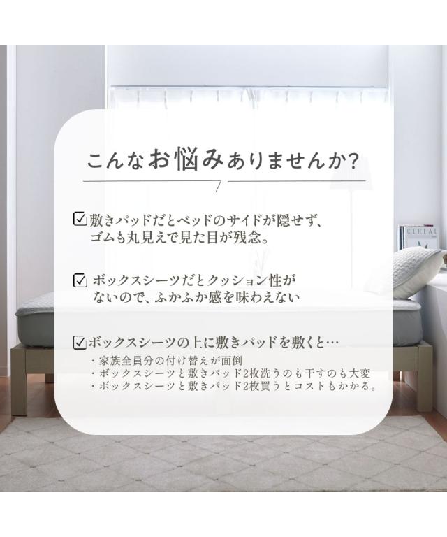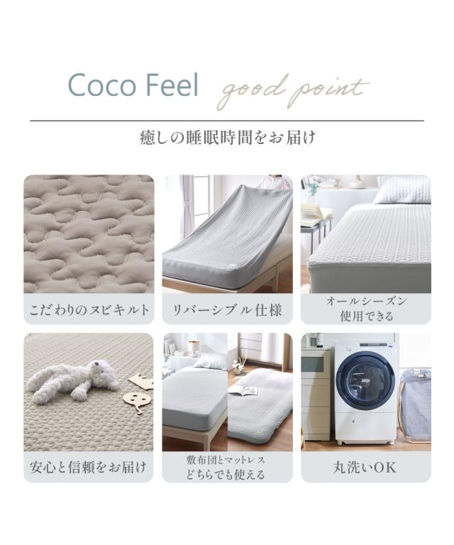 ひんやり冷感イブルとやわらかニットのリバーシブル一体型敷きパッドで、寝苦しい夜も快適に! 接触冷感面は接触サラリとしており、触れた瞬間にひんやりとした涼しさを感じられます。 ニット面は肌触りが良く、やわらかな風合いで快適な寝心地です。 ●種類 【敷きパッドの魅力】 マットレス・敷布団の上やボックスシーツ・敷きカバーなど、その上に敷いてお使いいただけます。肌に直接触れるので、肌触りや保温性などを敷きパッド1枚で調整することが可能です。また、シーツの上に重ねることで、気軽に取りはずしてこまめに洗濯できるのも大きな魅力です。 ●タイプ 【ボックスシーツ一体型敷きパッド・ベッドパッドとは】 ボックスシーツ一体型敷きパッドは、敷きパッド一体型ボックスシーツとも言われる「敷きパッド」と「ボックスシーツ」の2つが1つになった1枚で2役のとても便利な商品です。見た目がすっきりして、洗濯物の量も減らせ、着脱のしやすさもポイントです。 こんな方におすすめ ・寝室のインテリアにもこだわりたい方 ・とにかく家事を楽にしたい方 ・収納スペースをなるべくとりたくない方 ●ブランド・シリーズ 【CocoFeel】ココフィールって Coco Feel 『ココフィール』は