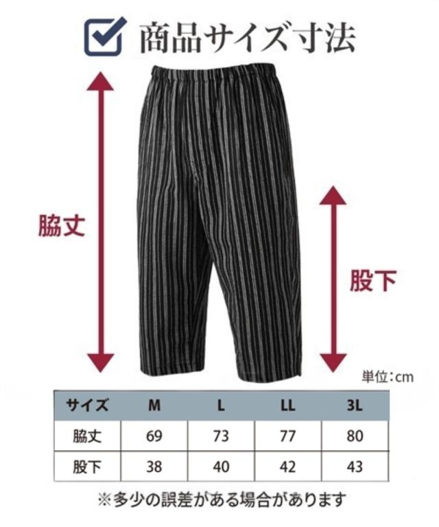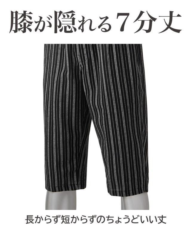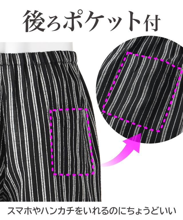 汗ばむ季節にさらっとしたはき心地が気持ちいいステテコパンツ <特徴> ■さらっと&シャリっとした風合いのクレープ素材 〜クレープ素材とは〜 ヨコ糸に通常の糸よりもさらに強い撚りをかけたものを使用することでできる「ちぢみ」を利用し、独特の風合いを出した涼感素材です。 ■ウエストゴムゆったり仕様 お腹にゴムか直接当たらないようにゴムを身生地にくるんでいます ウエストの締め付け感が少ないです ■7分丈 膝が隠れる丈です 長からず短からずの一番使いやすい丈の長さです ■後ろポケット付 右後ろにポケットがあります スマホやハンカチなどをいれるのにちょっと便利です ■前ボタン開き仕様 トイレの際に便利です ■セット組 毎日着用するものだから、洗い替えに便利なセット組でお届けします