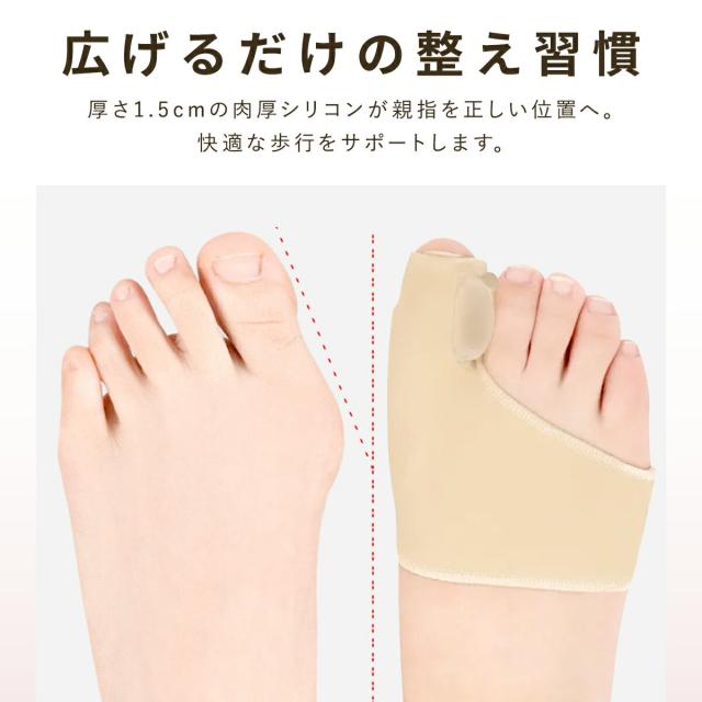 親指と人差し指の間に挟む1.5cmの肉厚シリコンが、曲がった足指を正しい位置へ広げることで、足裏の疲れを軽減。