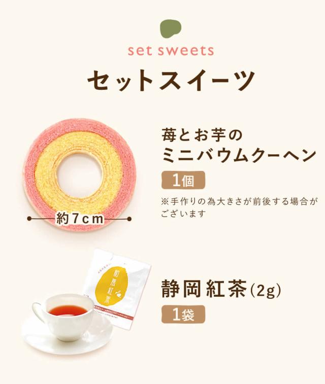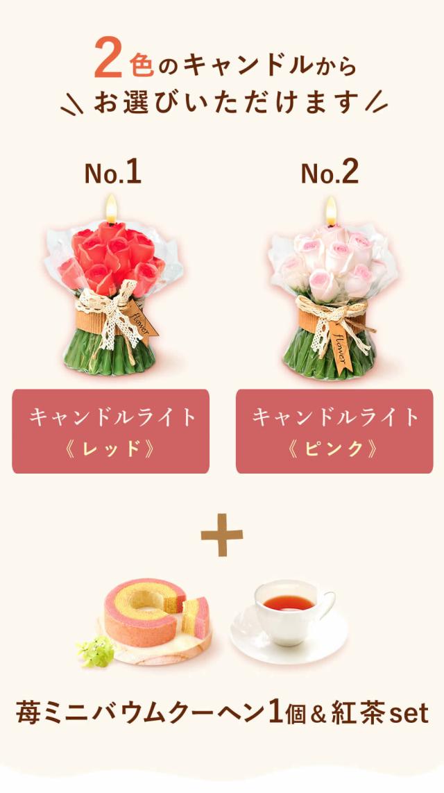 【選べるキャンドルライト】1個 【苺とサツマイモのバウムクーヘン】1個 【静岡紅茶(2g)】1袋 ◆苺とサツマイモのバウムクーヘン 賞味期限:2026年5月22日 原材料:卵(国産)、砂糖、ショートニング、マーガリン、小麦粉、乳等を主要原料とする食品、さつまいも、バター、苺果汁加工品、アーモンド加工品、さつまいもペースト、植物油脂、洋酒/加工澱粉、トレハロース、乳化剤、膨張剤、ソルビトール、香料、着色料(コチニール、ラック、カロチン)、酸味料、(一部に卵・小麦・乳成分・アーモンド・大豆を含む) ◆静岡紅茶(2g) 1袋 賞味期限:製造から約1年(未開封時)※パッケージ記載 原材料:緑茶(牧之原市) 【発送の温度帯】 常温便にてお届け |