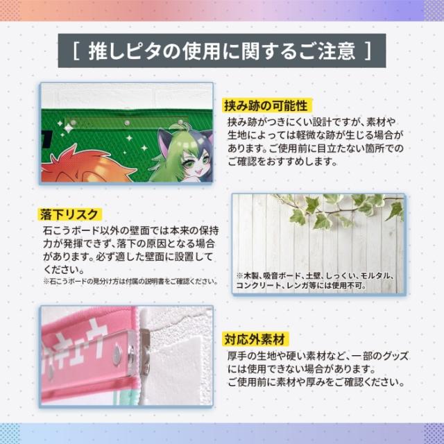 大切な推しグッズ、こんな飾り方していませんか? ●ダブルクリップで挟む・・・「クリップ跡がつく」 ●画鋲で固定・・・「穴が開く」 ●タペストリーバーを使用する・・・「見た目が悪い」 大切なグッズを傷つけてしまう原因に。 見た目も微妙、でも他に良い方法なんて・・・ あります!! グッズを傷つけない新しい飾り方「ダブルクリップ、卒業!」 その名も、タペストリークリップ「推しピタ」 |