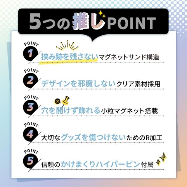 ●優しく挟んで固定!マグネットサンド構造 強力マグネットとアクリルを組み合わせ、『面で挟む』構造を実現。圧力を分散することで挟み跡が残りにくく、グッズへの負担を抑えながら安定して固定できます。 ●推しの邪魔をしない透明アクリル 本体にはアクリル素材を採用。グッズのデザインをできる限り隠さない設計です。 ●小粒でもしっかり固定 小粒マグネットを3個内蔵。試作を重ね、最適な位置に配置し「約1kgまで支える安心設計」です。また8mmと小粒なのでデザインの邪魔になりません。 ●大切なグッズを傷つけない保護設計 安心の「R加工」。角を丸く加工することで、生地への引っかかりやダメージを防止。大切な推しグッズを安心して飾れます。 ●信頼の東洋工芸かけまくりハイパーピン(R) 壁へのダメージが少なく、しっかり固定できる超強力石こう画びょうを付属。 |