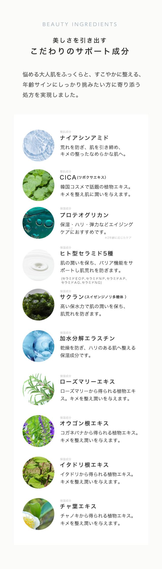 保湿成分ヒト型セラミド5種、整肌成分ナイアシンアミド等、厳選した美容成分を配合。肌との親和性を追求したこだわりのテクスチャーを実現。肌をぷるんとした潤いで満たし、内側から押し返すようなハリのある、ツヤやかな肌へと導きます。