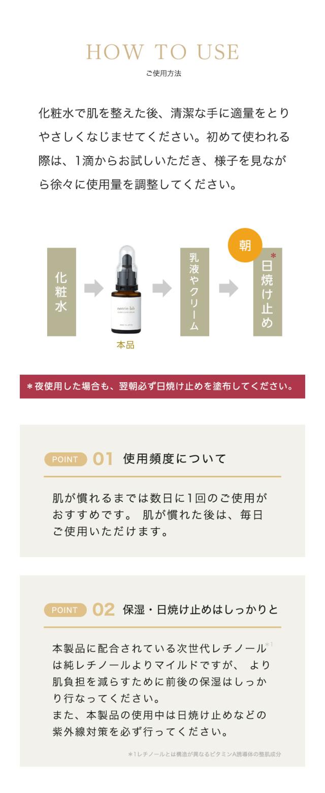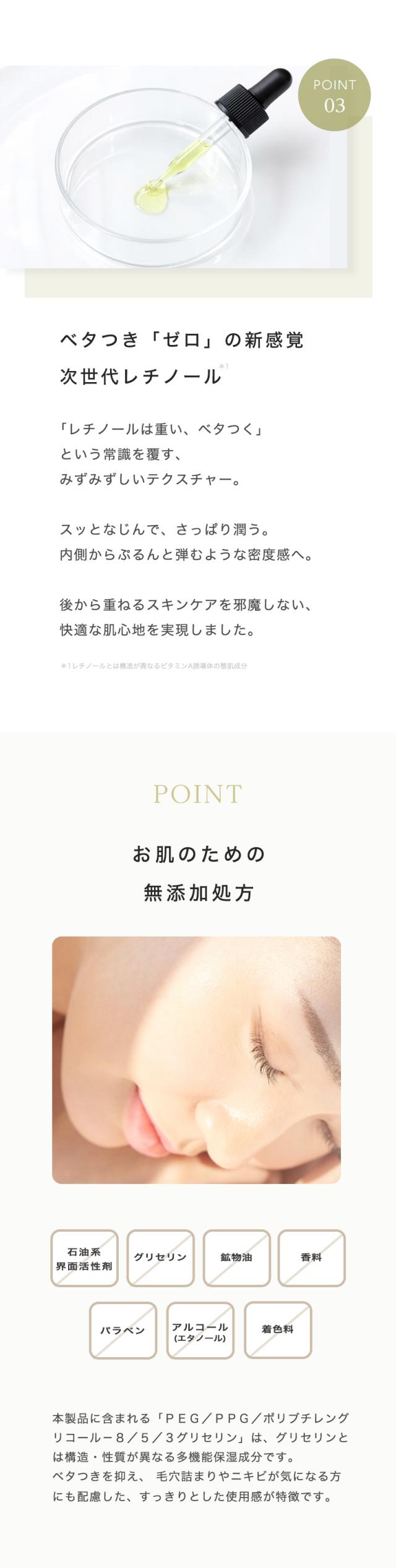 本製品には「純レチノール」そのものではなく、より安定性が高く、肌への負担を抑えた次世代レチノール様成分(グランアクティブレチノイド*3・バクチオール誘導体*4)を採用しています。 従来のレチノールに比べマイルドな設計ですが、肌質やその日の体調により、まれにピリつきや乾燥を感じるなど個人差があります。初めてご使用になる際は、少量(1滴程度)からお試しいただき、肌の状態を見ながら少しずつ使用量や頻度を増やしていくことをおすすめします。