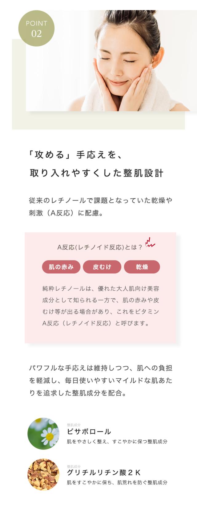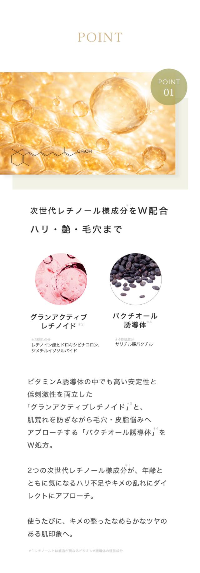 *1レチノールとは構造が異なるビタミンA誘導体の整肌成分、*2年齢に応じたケア、*3整肌成分(レチノイン酸ヒドロキシピナコロン 、ジメチルイソソルバイド )、*4整肌成分サリチル酸バクチル