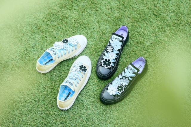 フラワーモチーフのオリジナルチャームが付属し、シューレースの好きな位置に取り付けることができる仕様。