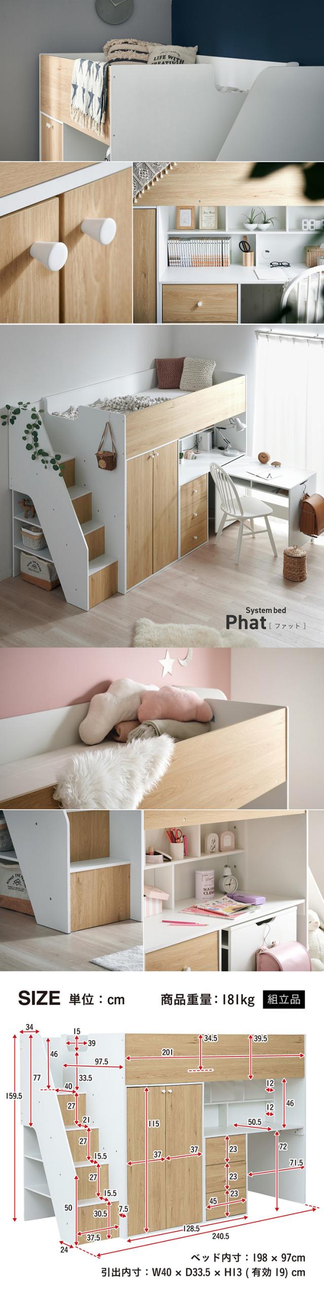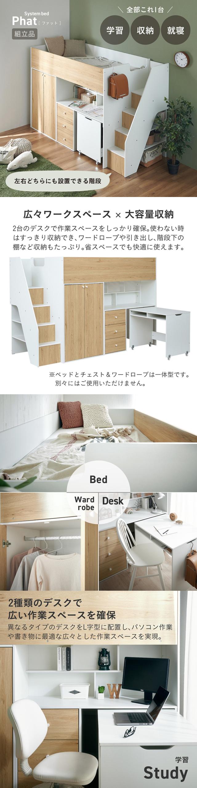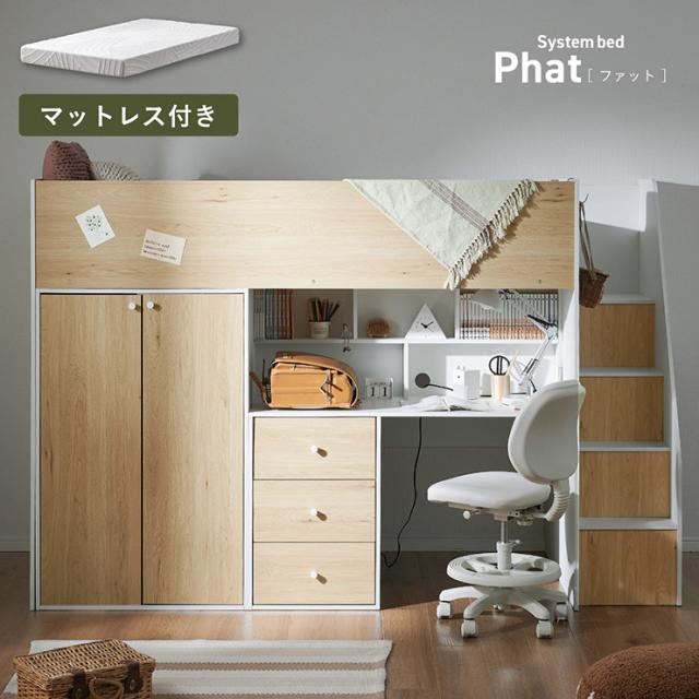 システムベッド ハイタイプ 中学生 デスク 学習机 大人 マットレス シングル Phat(ファット) + Unity(ユニティ) ホワイト システムベット デスク付き 子供 ロフトベッド 階段 木製 机付き おしゃれ 北欧