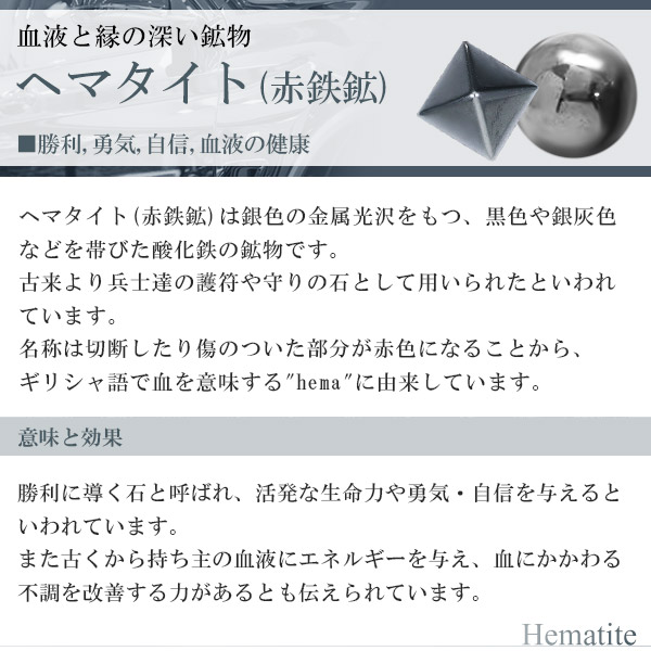 ヘマタイト(赤鉄鉱)は勝利に導く石と呼ばれ、活発な生命力や勇気・自信を与えるといわれています。