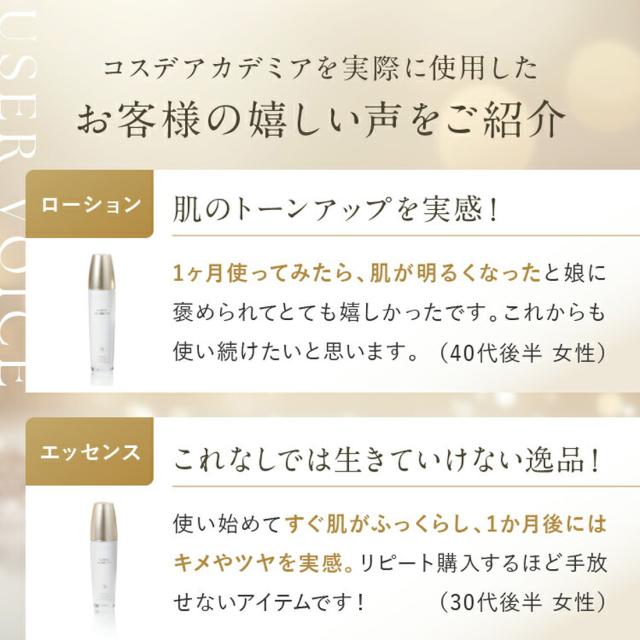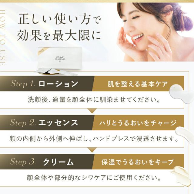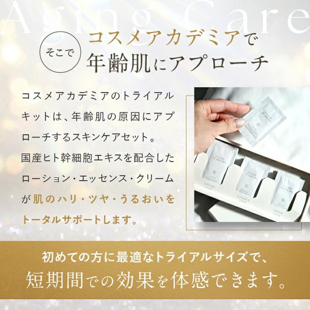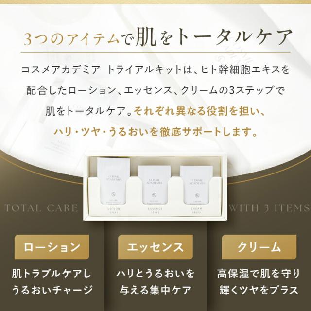 コスメアカデミア ローション(化粧水)と、エッセンス(美容液)、さらにクリームを加えたスキンケアセットのお試し体験キットです。