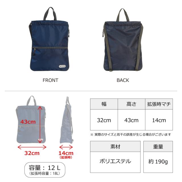 アウトドアプロダクツ 22469165 ナップサック リュック OUTDOOR PRODUCTS メンズ レディース ダイヤリップ 拡張可能 軽量 大容量 ジム 部活 旅行