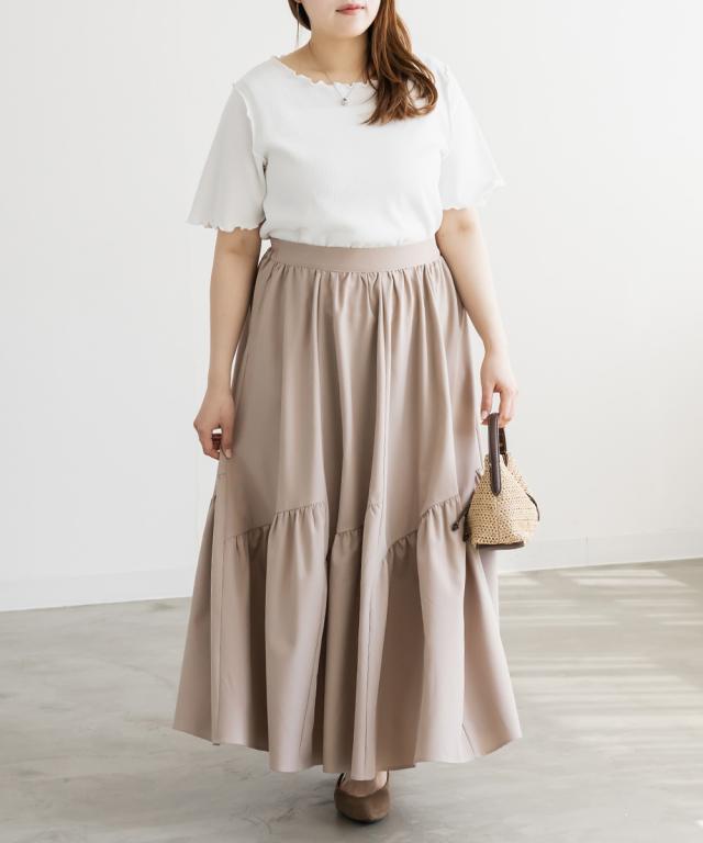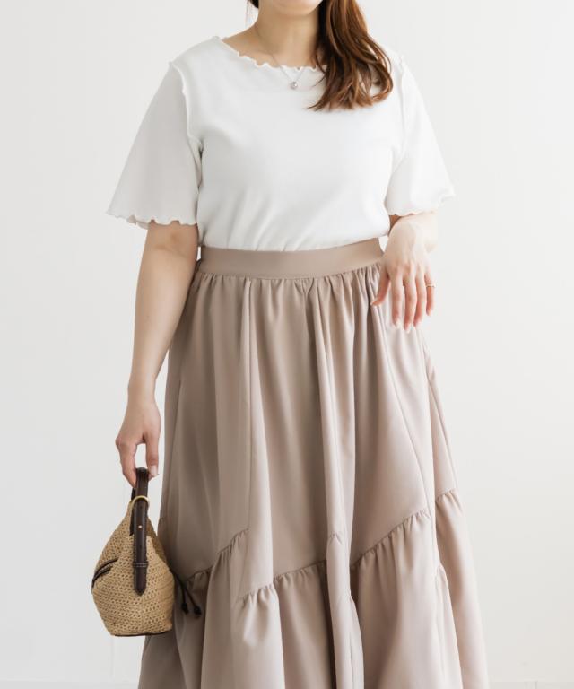 | 3Lサイズを着用してちょうどいいサイズ感でした!パネル切替のデザインが動くたびにきれいに広がって、軽やかで女性らしい印象に見せてくれます◎ボリューム感はありつつも広がりすぎないので、すっきりとバランスよく着られました♪ウエストも楽な穿き心地でストレスなく、シンプルなトップスと合わせるだけで華やかに決まる一枚です! |