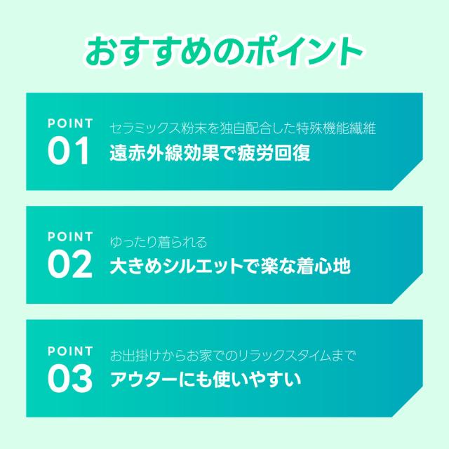セラミックス粉末を独自配合した特殊機能繊維を採用。遠赤外線の働きにより血行を促進し、疲労回復をサポートします。さらに、ハリやコリの緩和にも役立つため、日常のケアウェアとして取り入れやすい一枚です。
