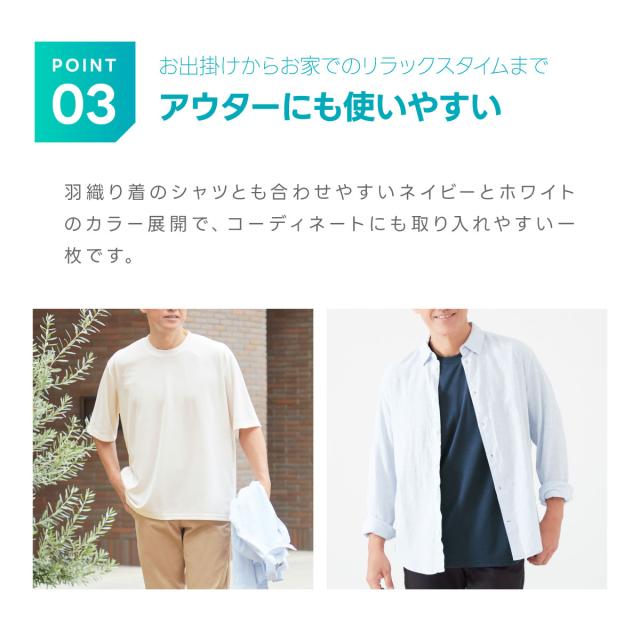 また、シンプルで使いやすいデザインに仕上げているため、アウターとしても着用しやすく、外出時にも違和感なく着られます。羽織り着のシャツとも合わせやすいネイビーとホワイトのカラー展開で、幅広いコーディネートに取り入れやすいのも魅力です。