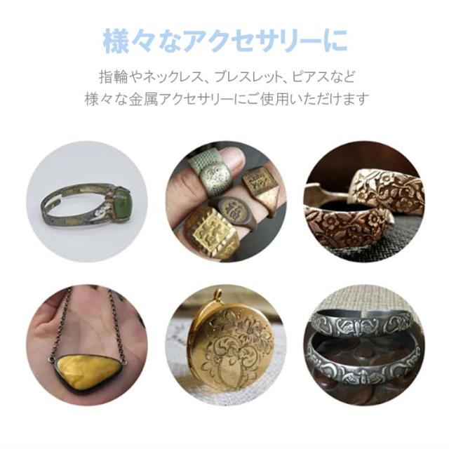 指輪やネックレス、ブレスレット、ピアスなど、様々な金属アクセサリーにご使用いただけます。