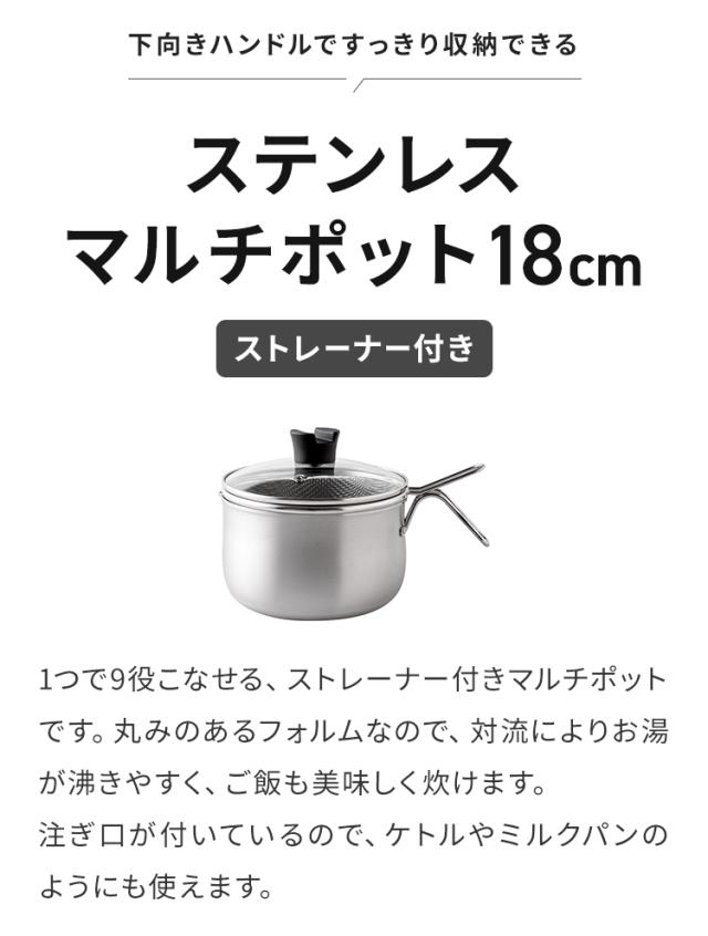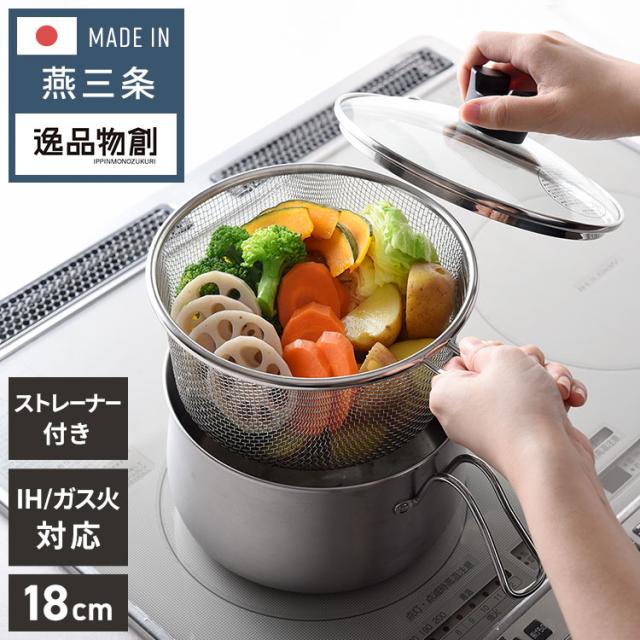 日本製 燕三条 ストレーナー付き ステンレスマルチポット 18cm 深型 ガラス蓋 ガス火 IH対応 2.9L 逸品物創 ステンレス製 鍋 ざる ザル コンパクト スリム 片手鍋 揚げ鍋 天ぷら鍋 78168【送料無料】