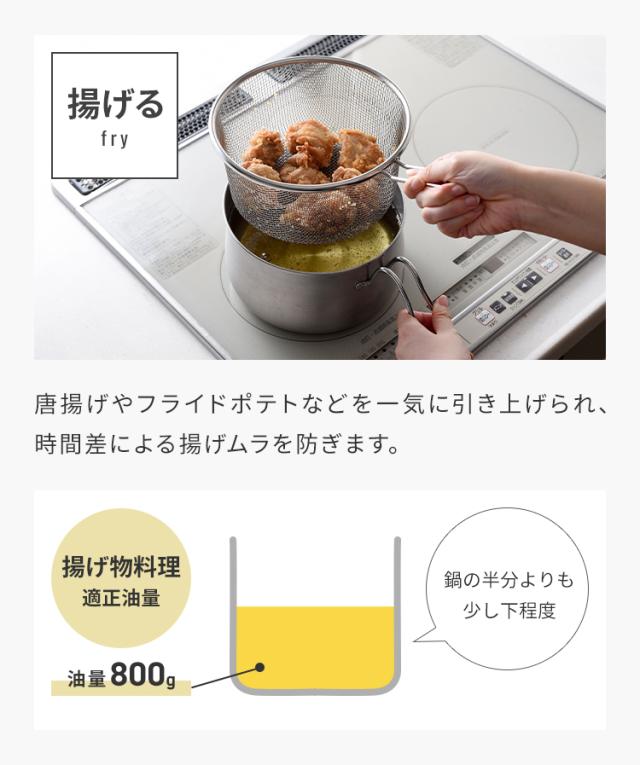 揚げる:唐揚げやフライドポテトなどを一気に引き上げられ、時間差により揚げムラを防ぎます。