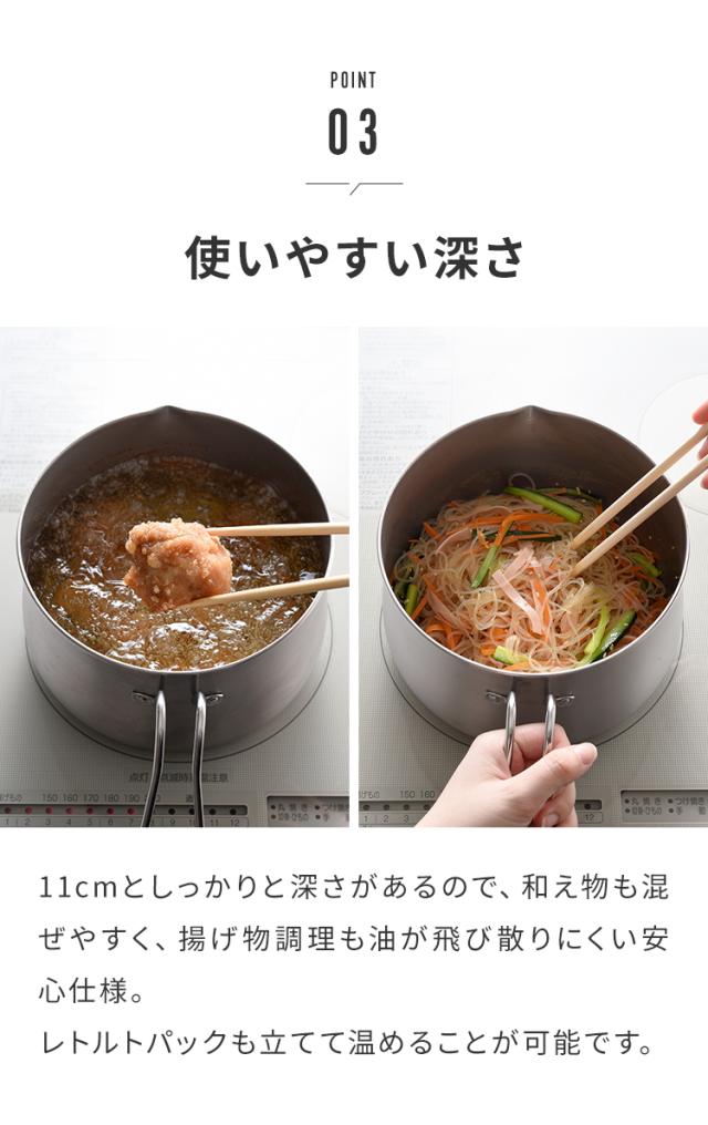 ■深さが有るので和え物も混ぜやすく、揚げ物調理も油が飛び散りにくいです。レトルトパックも立てて温める事ができます。